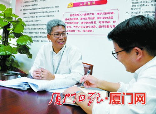 象嶼股份黨委副書記、副總經(jīng)理齊衛(wèi)東(左)跟員工探討項(xiàng)目落實(shí)情況。(《廈門日?qǐng)?bào)》記者 黃曉珍 攝)