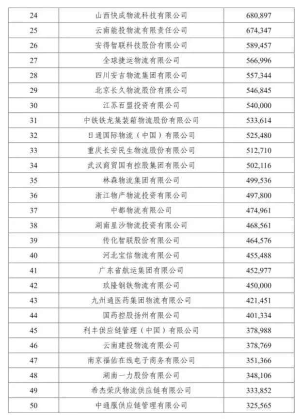 該榜單由中國物流與采購聯(lián)合會組織評選,按照重點(diǎn)物流企業(yè)統(tǒng)計(jì)調(diào)查結(jié)果提出了2019年度中國物流企業(yè)50強(qiáng)排名。據(jù)悉, 50強(qiáng)物流企業(yè)2018年物流業(yè)務(wù)收入合計(jì)9833億元,按可比口徑計(jì)算,同比增長16.9%。50強(qiáng)物流企業(yè)門檻提高到32.6億元,比上年增加3億元。