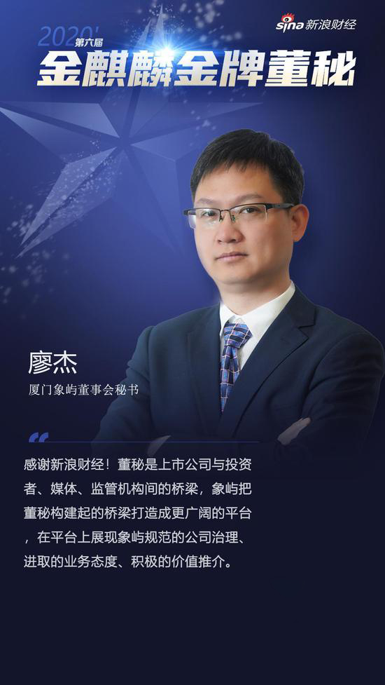 廈門象嶼董事會秘書廖杰獲評新浪財(cái)經(jīng)“2020年度金麒麟·金牌董秘”