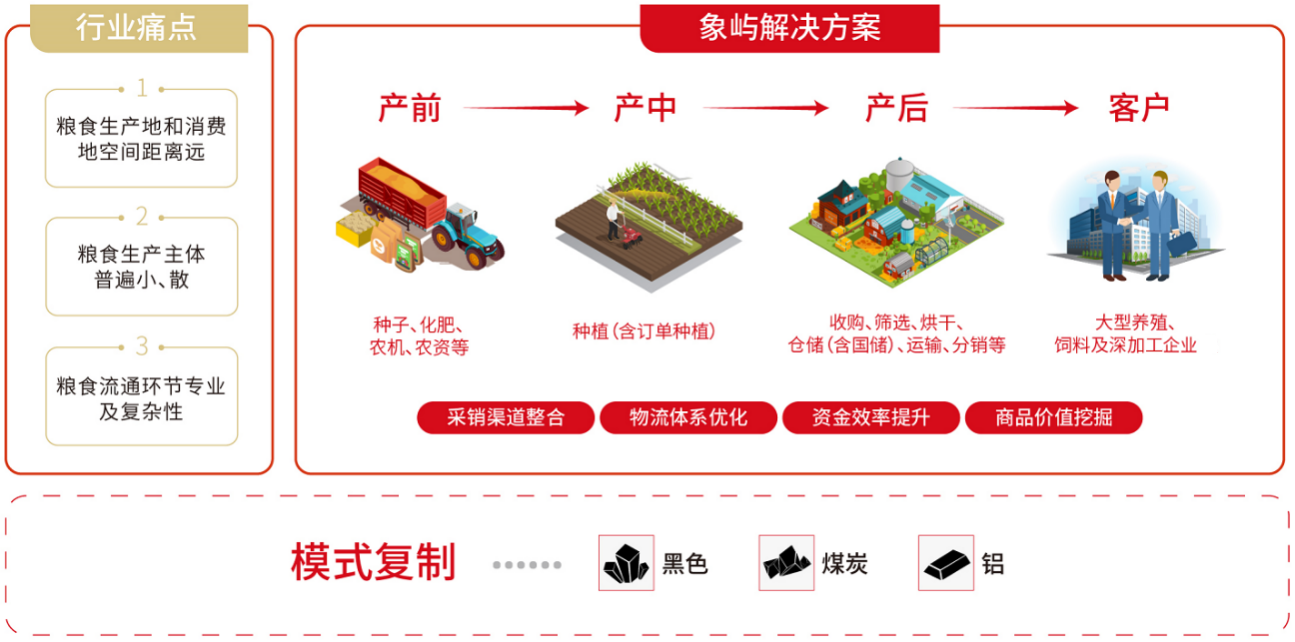 今年初,象嶼聯(lián)手阿里云結(jié)合東北農(nóng)業(yè)實(shí)際,攜手在糧食板塊先行先試建設(shè)農(nóng)業(yè)產(chǎn)業(yè)級(jí)互聯(lián)網(wǎng)平臺(tái)。該平臺(tái)將貫穿糧食產(chǎn)業(yè)鏈種植、倉儲(chǔ)、流通三大環(huán)節(jié),借助物聯(lián)網(wǎng)、云計(jì)算、區(qū)塊鏈?zhǔn)侄螌?shí)現(xiàn)輕資產(chǎn)模式下倉容快速擴(kuò)張,連接用糧方、金融、物流等生態(tài)方,提升全產(chǎn)業(yè)鏈貿(mào)易、物流與金融效率。 未來,象嶼農(nóng)產(chǎn)將做深“一條鏈”,做大“一個(gè)園”,形成共創(chuàng)共享共贏的全產(chǎn)業(yè)鏈資源生態(tài)系統(tǒng),圍繞“雙循環(huán)”發(fā)展格局,進(jìn)一步優(yōu)化投資結(jié)構(gòu),延伸投資鏈條,創(chuàng)新產(chǎn)業(yè)模式,為鄉(xiāng)村振興、促進(jìn)農(nóng)業(yè)高質(zhì)高效發(fā)展貢獻(xiàn)力量!