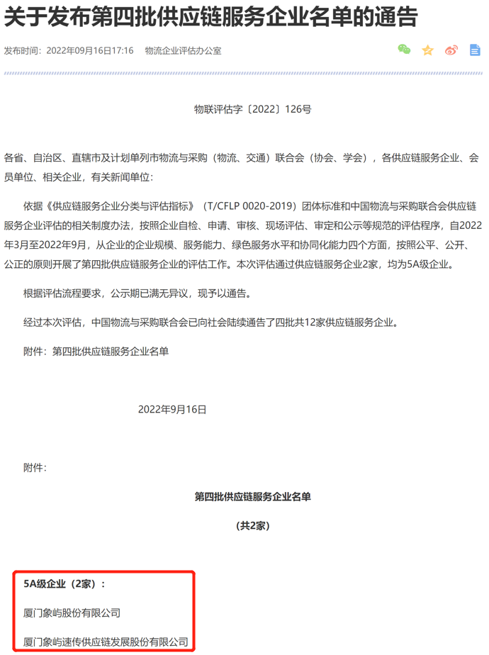 近日,象嶼股份及旗下象嶼速傳通過“5A級供應鏈服務企業(yè)”評估,這也是目前福建省僅有的2家通過該評估的企業(yè)。